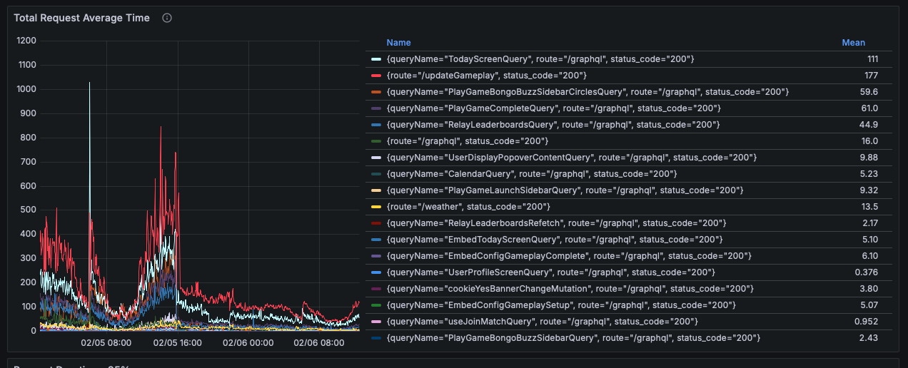 What you’re looking at is the average time it takes to handle an API call from puzzmo.com. Half-way through the day we deployed a single change which flattened the average request time drastically. We’ll see what it looks like comparing peak daily traffic to peak daily traffic.