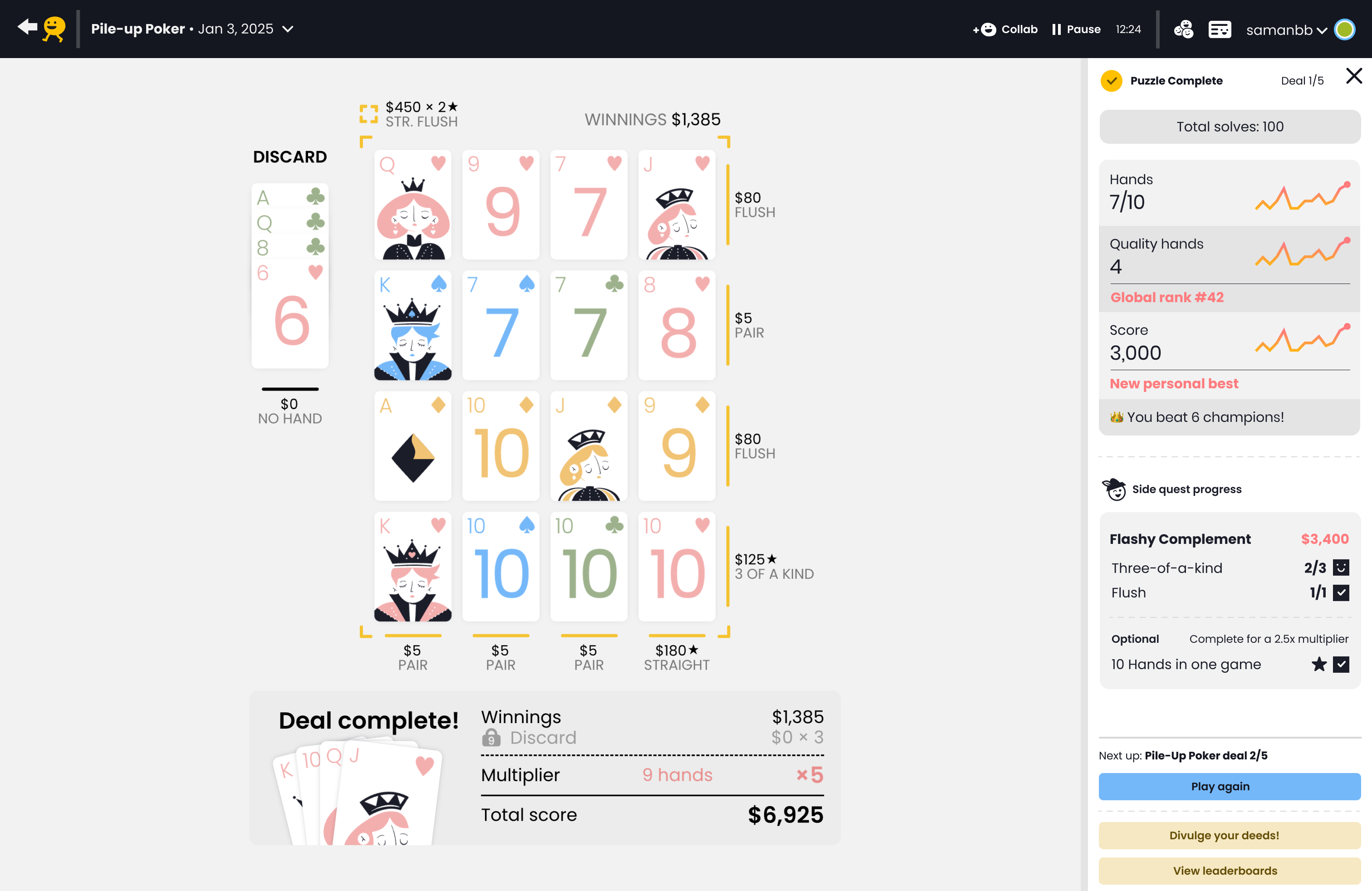 Every game we launched last year came with at least one big new feature: Bongo circles, Pile Up Poker Series, Weather Memoku’s weather widget. We launched game variants, customizable group leaderboards, time series sparklines on completion screens, game replays, and even a year-end recap. I could keep going. We’ve been busy since launch. Along the way, we gathered tons of valuable feedback from players about what they love and what they can’t stand about Puzzmo.com.