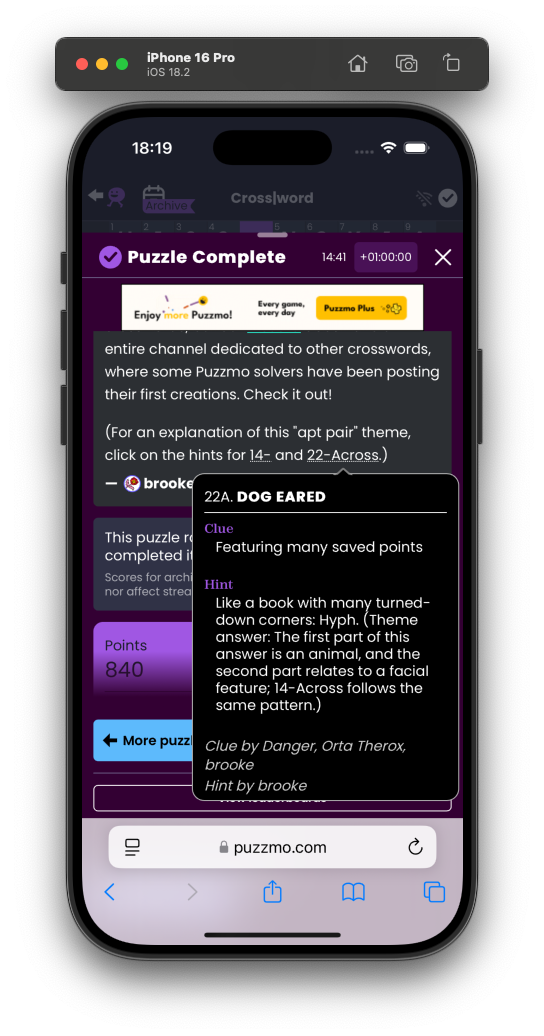 Me? I was working on the iOS app, which is mostly invisible work but my main focus is ole’ bizdev. Plumbing Puzzmo into libraries, converting some of our existing infrastructure into services and working with big partners to put puzzles in unexpected places.