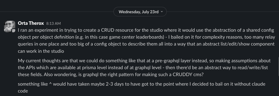 Or a recent example from slack where I just vibed for half a day in the background on trying to make an abstraction for CRUD resources in our CMS tools: